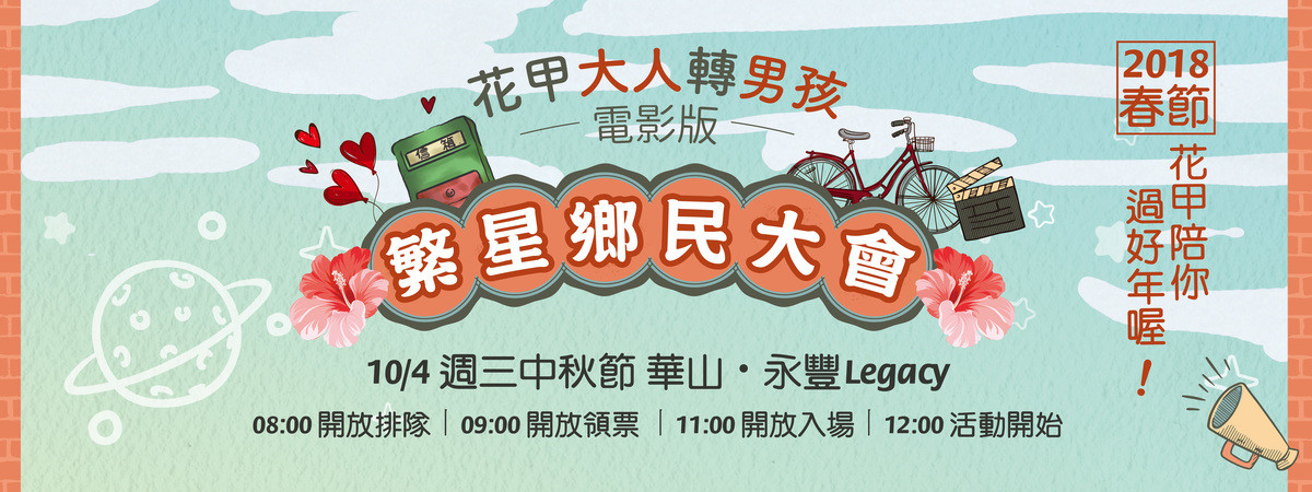 6、 此活動預購套票贈品:「繁星鄉民證」及「繁星鄉民大會簽名板」於10/4當日現場領取,請務必提前至現場排隊領取;若無法到場領取者,請於備註欄註明,贈品將於正式上片前2週連同電影兌換券及花甲旺來包掛號寄出。